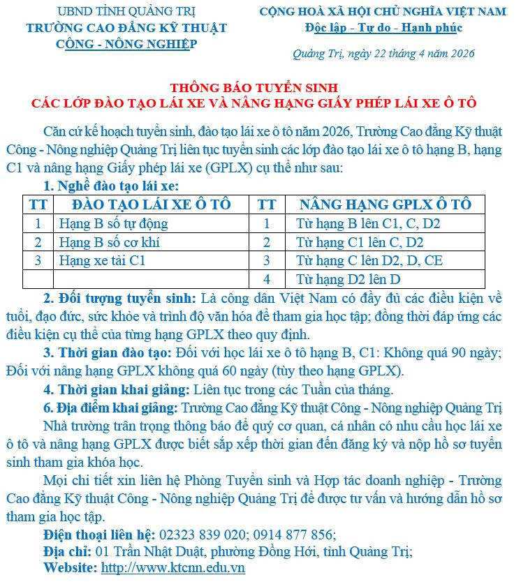 THÔNG BÁO TUYỂN SINH CÁC LỚP ĐÀO TẠO LÁI XE Ô TÔ VÀ NÂNG HẠNG GPLX Ô TÔ:
